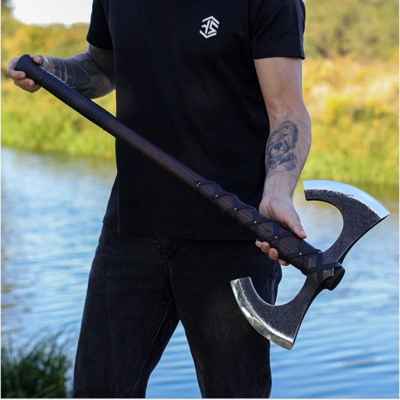 Viking long axe "Ragnar Lodbrok" with carving handle and leather wrap