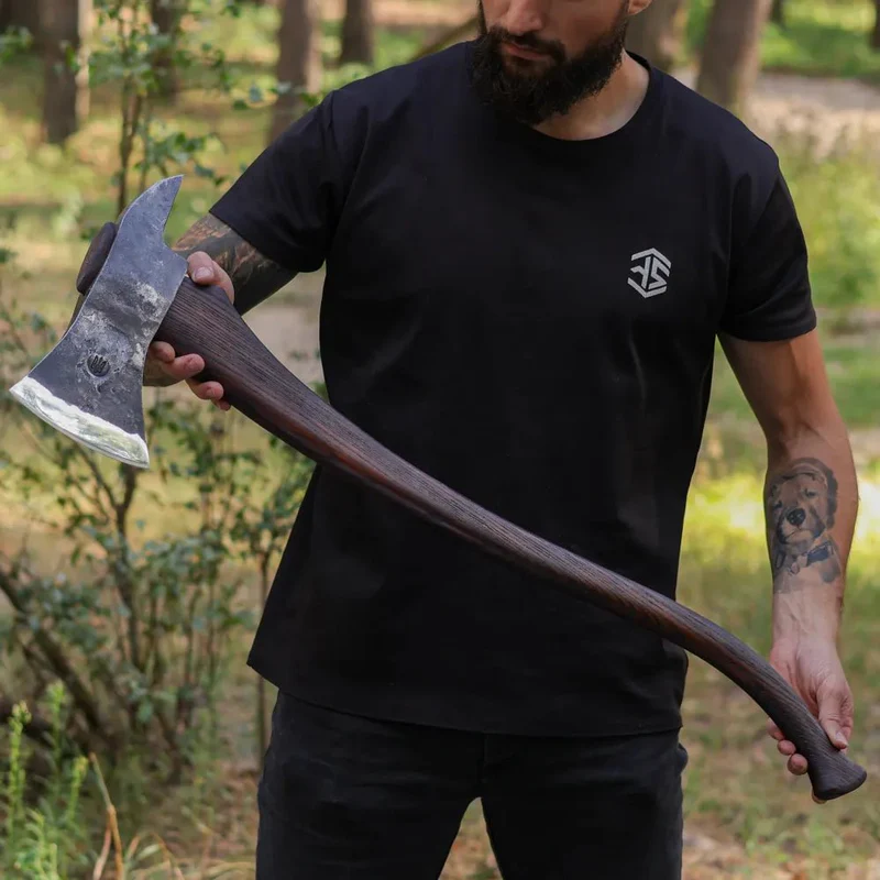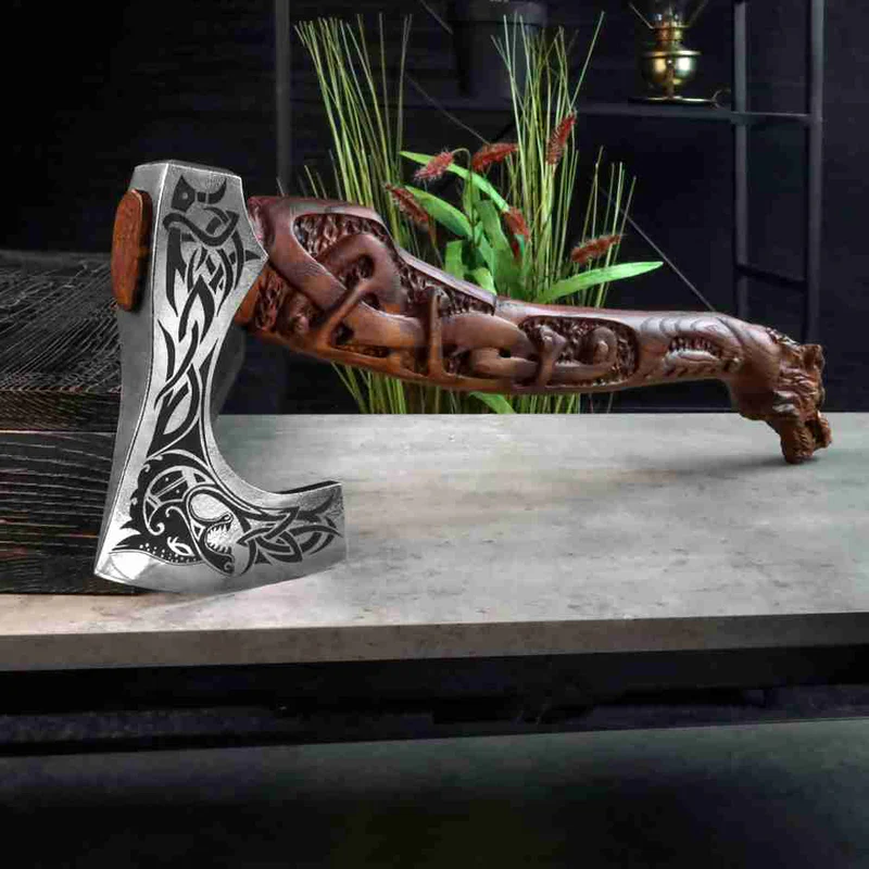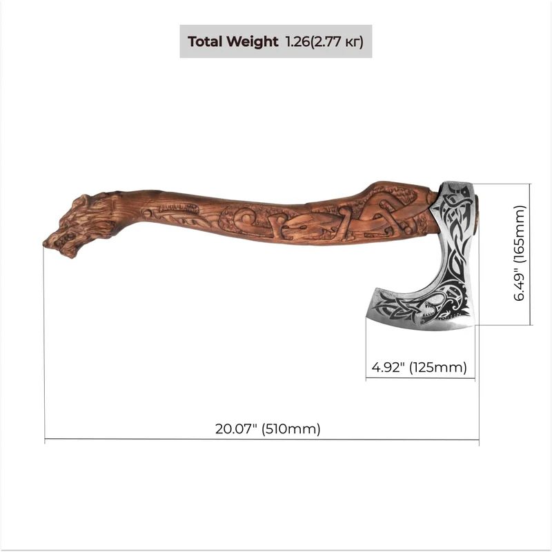 Hand-forged hardened bearded viking axe "Fenrisulfr" with carved handle