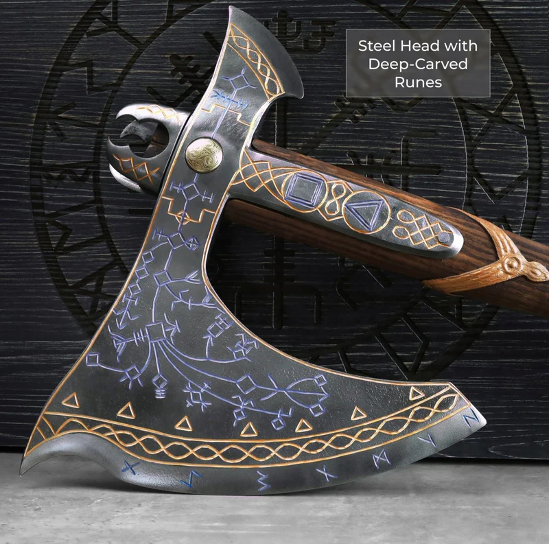 Detailed Specifications: This Kratos Axe measures an overall length of 38.1", with blade-to-blade length at 14.56". It weighs approximately 8.04lb. Hand carved handle provides balance and a comfortable grip.