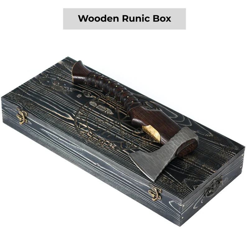 Product Specifications: Boasting an overall length of 17.71" and weighing 2.42lb. The axe's hardness stands at Rockwell ~48–54 HRC. It comes with a protective leather cover and an optional wooden box, enhancing its elegance and gifting appeal.
