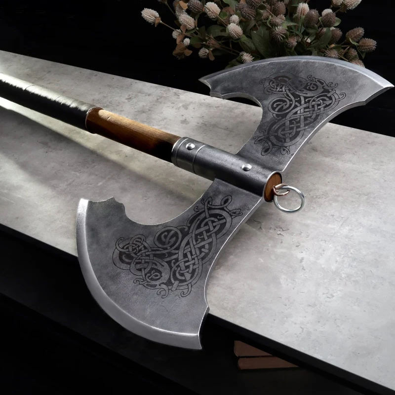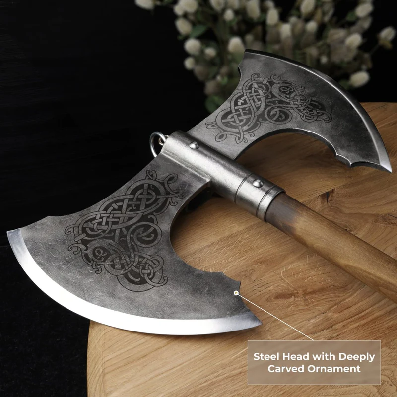 Masterful Norse Craftsmanship: Unleash the power of Viking heritage with the Jotungard double-edged axe. This masterpiece is inspired by ancient Norse warriors, designed for artistry.